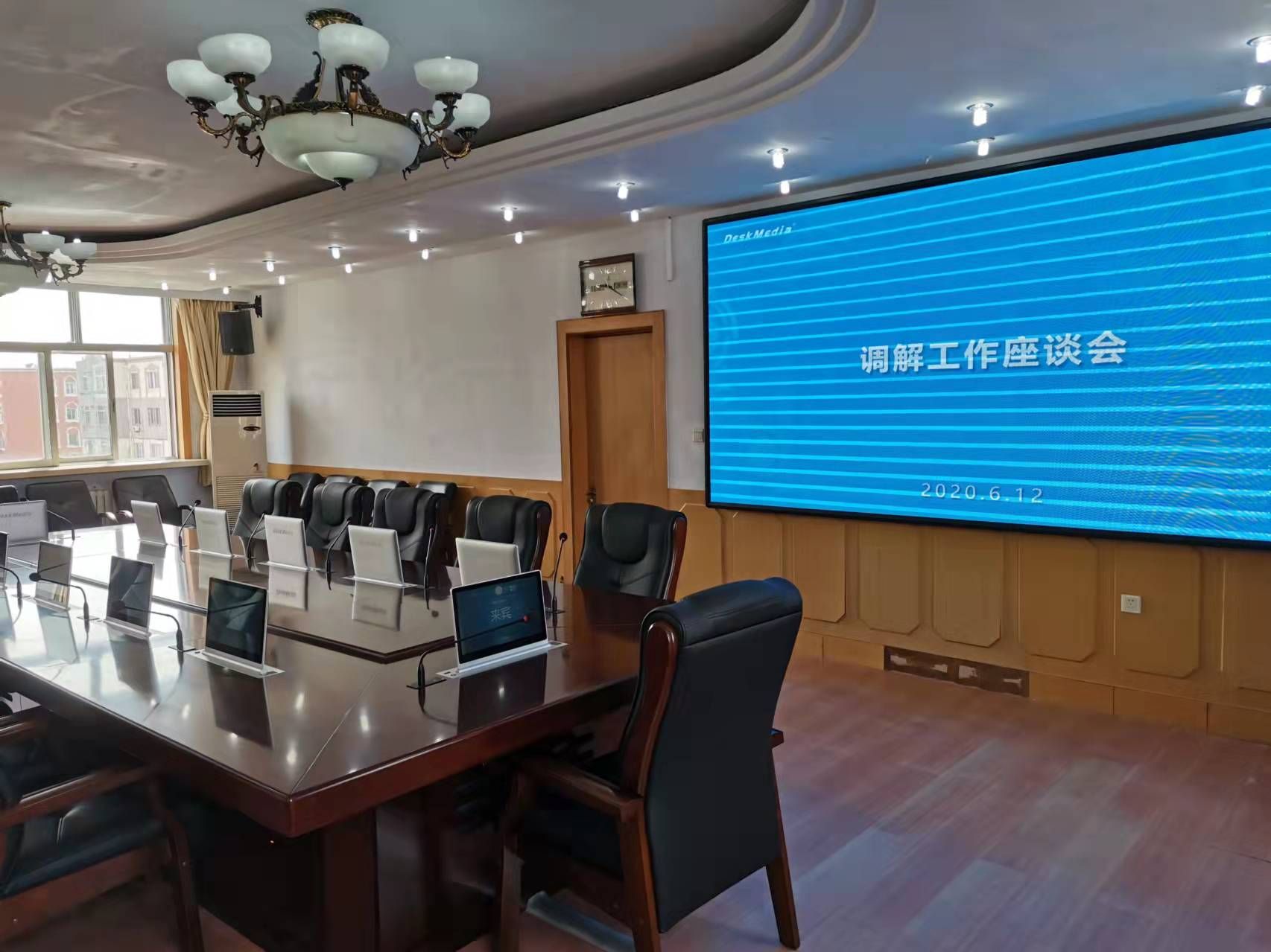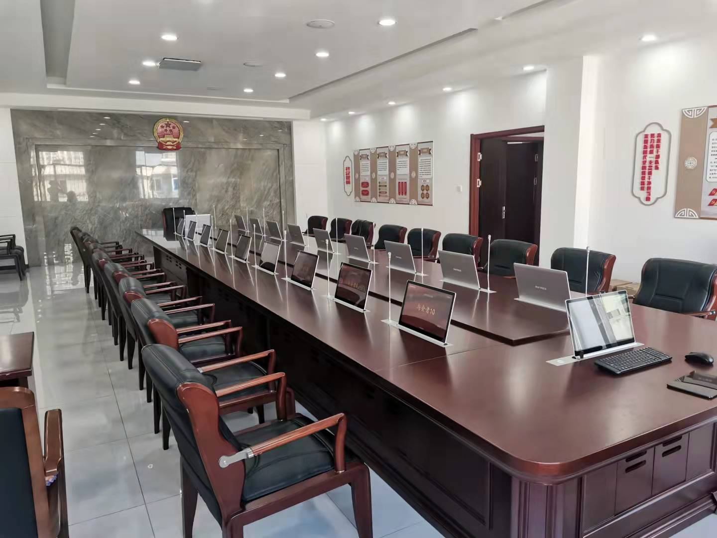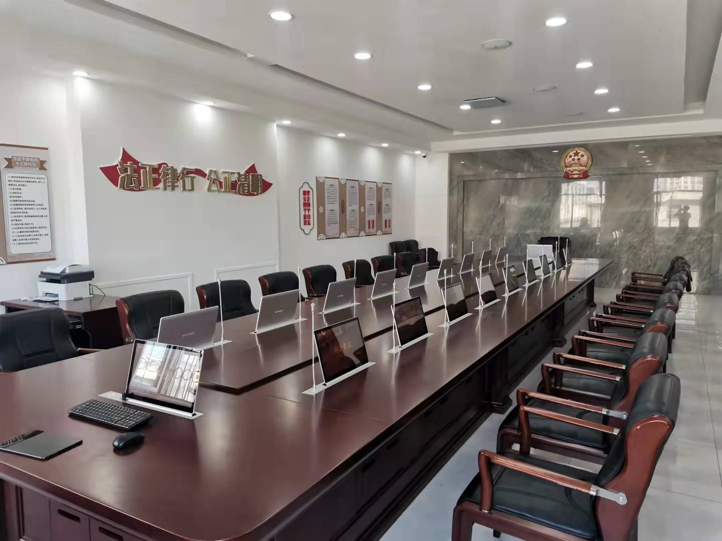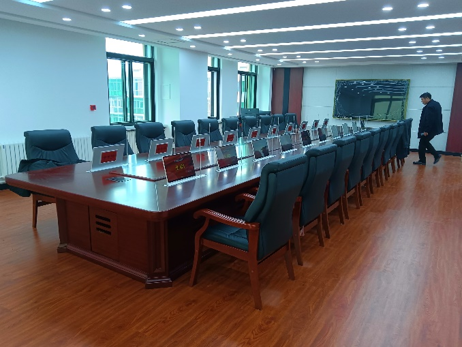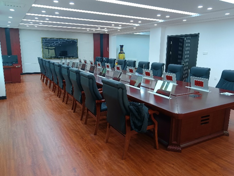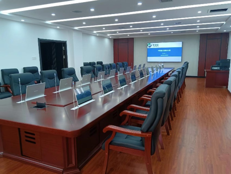 2023年10月,银州区人民法院无纸化审委会会议室和党组会议室改造完成,本次会议室改造包含基础装修升级、会议桌椅、20个席位的一体化操作终端、交互显示大屏、发言系统、扩声系统等,并融合语音识别系统,实现会议过程中音频实时转写成文字,辅助会议记录人员进行纪要的整理与校正。通过此次改造,提高法院会议办公的信息化水平,提高司法办案、办公的工作效率,实现法院的审判业务的智慧化、科技化、现代化、高效化。