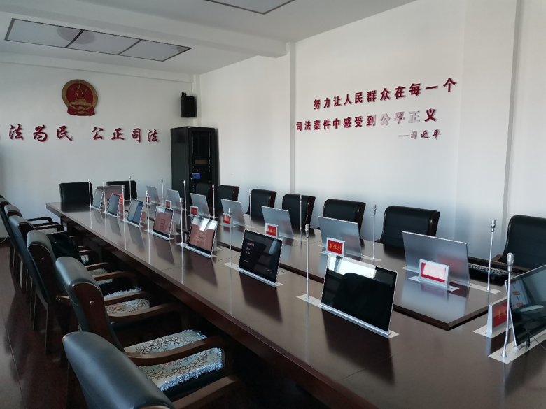 2023年10月,铁岭县人民法院无纸化审委会会议室改造完成,本次会议室改造包含基础装修升级、会议桌椅、18个席位的一体化操作终端、交互显示大屏、发言系统、扩声系统等,并融合语音识别系统,实现会议过程中音频实时转写成文字,辅助会议记录人员进行纪要的整理与校正。通过此次改造,提高法院会议办公的信息化水平,提高司法办案、办公的工作效率,实现法院的审判业务的智慧化、科技化、现代化、高效化。