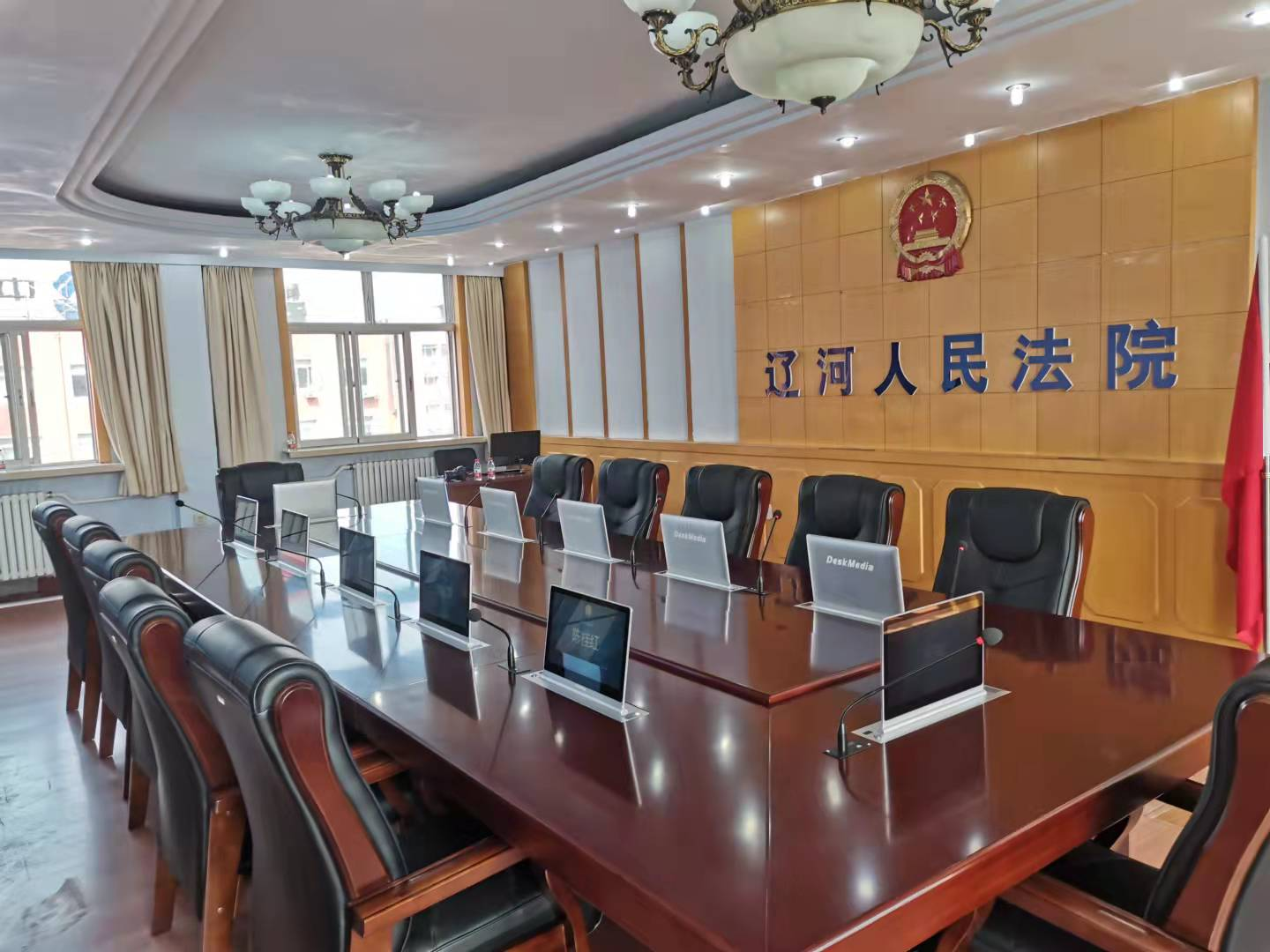 2020年10月,辽阳市太子河区人民法院无纸化审委会会议室改造完成,本次会议室改造包含基础装修升级、会议桌椅、16个席位的一体化操作终端、电子桌牌、交互显示大屏、发言系统、扩声系统等,并融合语音识别系统,实现会议过程中音频实时转写成文字,辅助会议记录人员进行纪要的整理与校正。通过此次改造,提高法院会议办公的信息化水平,提高司法办案、办公的工作效率,实现法院的审判业务的智慧化、科技化、现代化、高效化。